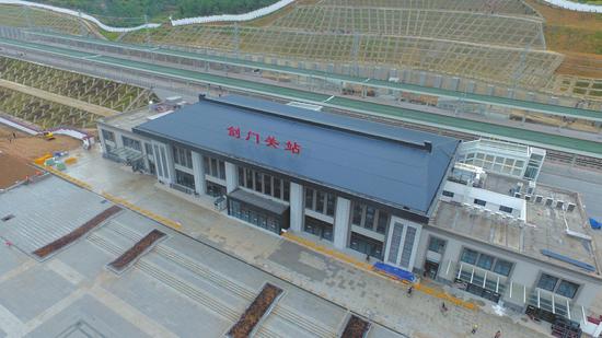 剑门关,是西成客专入川后的第一景。从空中俯瞰剑门关车站,外形和蜀道剑门关如出一辙,站房主体已完工,工人正忙碌收尾,站台上的检测车来来往往。