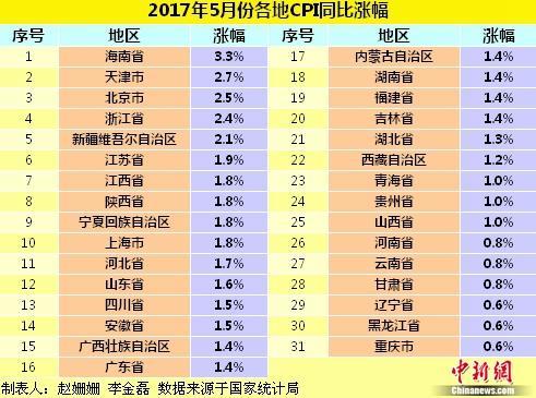 中新网北京6月20日电 (记者 李金磊)国家统计局近日公布了全国31个省(区、市)5月份居民消费价格指数(CPI)。数据显示,28个省份5月份CPI同比涨幅较4月份出现不同程度扩大。其中,海南省5月份CPI涨幅迈入“3时代”,为全国最高。